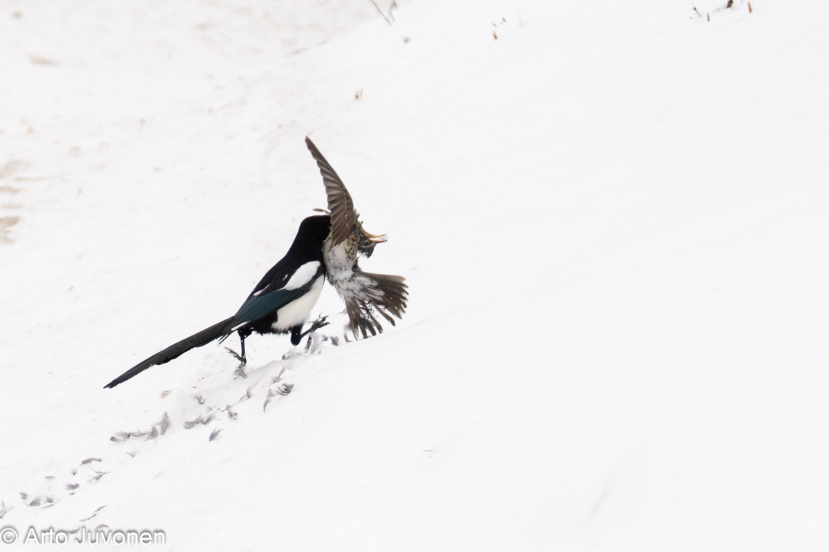 Harakka, saaliina räkättirastas Magpie and Fieldfare Pica pica & Turdus pilaris 12.1.2025 Loviisa Canon EOS R6, 200 mm, f/6.3, ISO-2500, 1/2000 sec, Hand held | |||