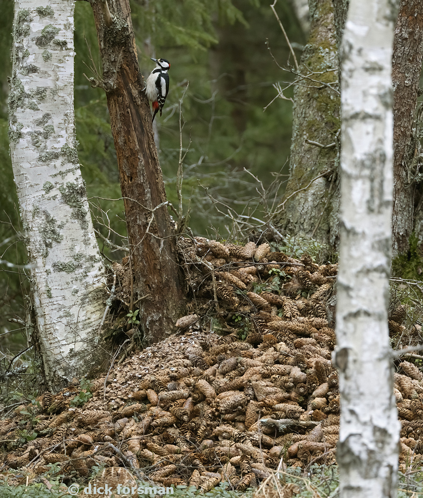 Great Spotted Woodpecker (Dendrocopos major) working hard at its anvil. This is one of the more impressive anvils I've seen over the years. The pecker brings the cones (in this case of Norway Spruce) to its anvil, to extract the seeds. Processed cones are discarded and dropped to the ground. This pile would be the leftovers from this winter. |