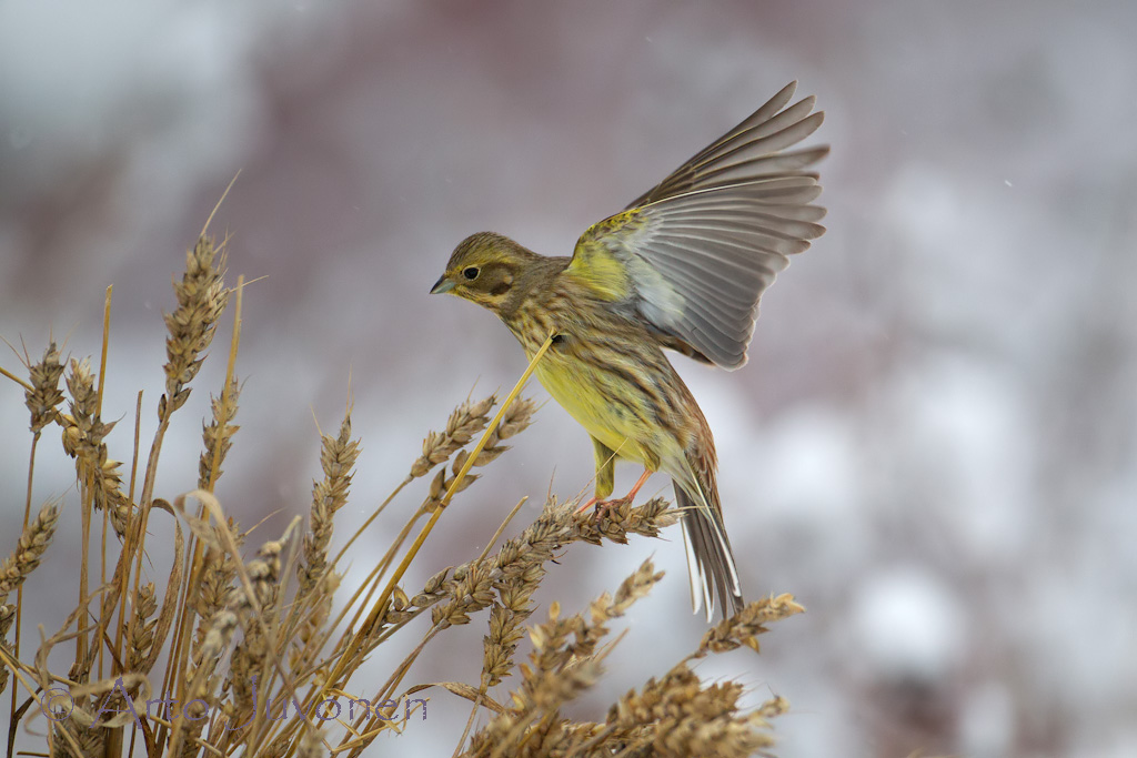 Snow cover has finally so thick that Yellowhammers have got at feeding places. At our cottage garden was around 80 Yellowhammers and same amount of Tree Sparrows. Sheaf of Wheat is works well as food for winter birds and also for me as bird photographer.