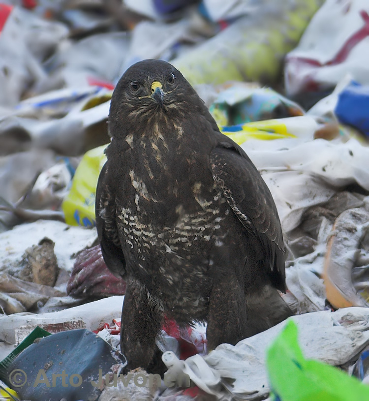 Porvoon kaatopaikalla lokkien, varisten ja korppien seassa tonkee jätekasoja ainakin kaksi, ehkä kolme hiirihaukkaa. Lisäksi paikalla on pitkin alkutalvea näkynyt kaksi eri merikotkaa. Tietysti paikalla saalistelevat myös kanahaukat ja huuhkajapari. Eli petoja on mukavasti. Hiirihaukka on ollut vaikea lähestyttävä. Jostain syystä tällä kertaa onnistui. Ehkä ne vielä kesyyntyvät talven edetessä.