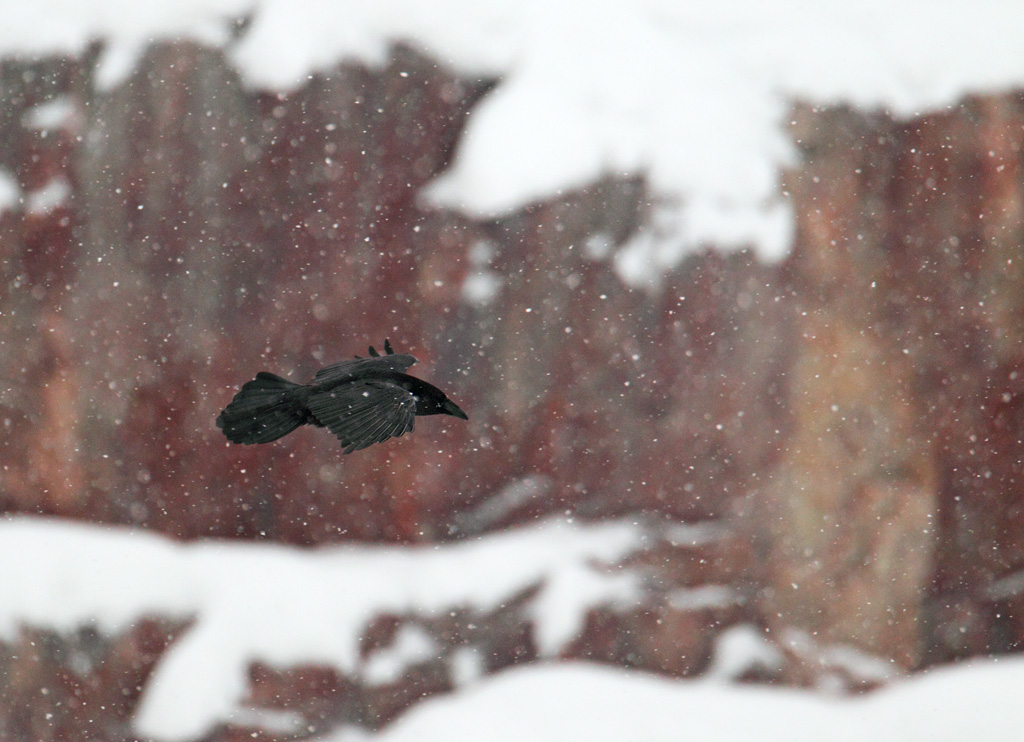 Kokeillaan nyt tällaisella taidekuvalla, kuinka puree arvostelijoihin. Viikonkuvassa näkyy viikonvaihteen sää - sakeaa lumisadetta. Havaintotilanteessa lumisade vasten tummaa lintua näytti kivalta. Valotusaika 1/125 kasvatti hiutaleet viiruiksi ja jätti siiven liikeen näkyviin.