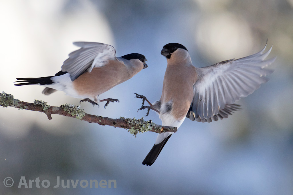 Aamulla tuuli puhalsi todella navakasti. Myrskypuhurin ajama lumi piiskasi kasvojani kipeästi kävellessäni jäällä kohti saarta, jonka aikaisemman kokemuksen perusteella ajattelin olevan oiva paikka kuvata tuulessa kisailevia merikotkia. Aurinko paistoi tyynen puolelta saarta, joten myötävalon puolella olosuhteet olivat vähintään siedettävät. Oli todella hauskaa seurata lähietäisyydeltä kotkien, korppien ja varisten leikkiä tuulessa. Ainoa huono puoli oli tietysti se, että lintujen nokka tahtoi olla koko ajan poispäin kuvaajasta -vasten tuulta. Joka tapauksessa kuviakin syntyi.
