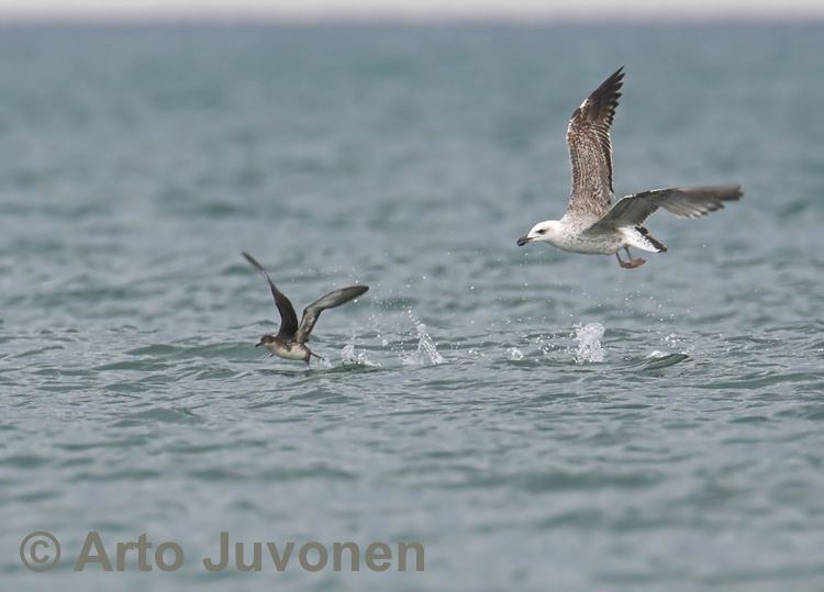 Etelänharmaalokit seurasivat idänpikkuliitäjien (en ole varma, onko nimi oikea) parvia. Liitäjän noustessa pintaan lokit yrittivät hyökätä välittömästi liitäjän kimppuun - käsittääkseni vain anastaakseen kalasaaliin. Havaittuani lokkien toimintatavan, odotin liitäjän nousua pintaan saadakseni kuvan hyökkäyksestä. Liitäjä oli aivan liian nopea lokille.