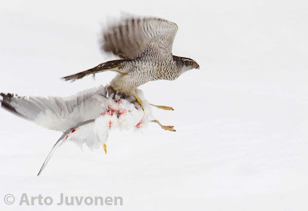 Kanahaukka saalina harmaalokki Goshawk with a Herring Gull Accipiter gentilis & larus argentatus Porvoo, Finland, 20.3.2010 Canon EOS 1D Mark IV, EF 500 mm F/4 L IS USM * 1.4 ext. |