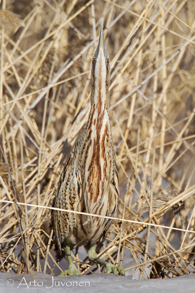 Paluumatkalla sillalta, ohittaessani merenlahtea näin ruovikon reunassa noin sadan metrin päässä tieltä ylimääräisen möhkyn. Kiikareilla varmistui että se oli se miltä näytti eli kaulushaikara ottamassa aurinkoa pienen pystyruovikon tuulensuojaisella sivulla. Pysäytin auotn ja mietin lähestymisstrategian. Kävelin ensin suoraviivaisesti haikaran ohi jäälle ja sieltä hitaasti siksakkia edeten pääsin aivan lähietäisyydelle kohdetta. Kun lintu näytti ensimmäisen hermostumisen merkin, poistuin paikalta haikaraa lentoon ajamatta. Hyvin siis meni. Jalkakin vajosi vain kerran jään läpi.