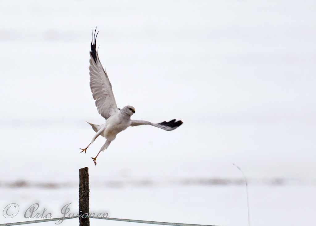 Viikonkuva on otettu toisena pääsiäispyhänä kevään ensimmäisellä kahluuretkellä. Olisi pitänyt mennä jo aiemmin, sillä tässä vaiheessa sula oli jo liian laaja. Pääkohteena olleet merimetsot kalastelivat kaukana salmen suulta. Harvinaisen lintulajin löytyminen innostaa aina. Vaikka arosuohaukka on nykyään jo luokiteltavissa ehkä pikkuharvinaisuudeksi, on petomaailma kaunokainen - koiras arosuohaukka - erityisen mukava nähdä. Olin ajelemassa Lapinjärven aukeita hiljalleen mökille päin, kun vähän matkaa edessäpäin vaalea suohaukka lensi vauhdikkaasti yli tien hevosaitaukseen pikkulintuja jahtaamaan, kadoten samalla metsikön taa. Pysäytin auton ja suuntasin kameran metsikön toiselle puolen, josta haukka lensikin dokumetoitavaksi kameran näkökenttään. Arosuo katosi, mutta risteily enemmän tai vähemmän ajokelvottomilla peltoteillä palkitsi haukan uudella löytämisellä. Arosuohaukka ja muutama sinisuohaukka yrittivät saada saalista peltoaukean mielettömän suuresta peippoparvesta. Alla oleva kuva arosuohaukasta on paras minkä sain. Kyllähän siitä jo hyvinkin lajin tunnistaa.