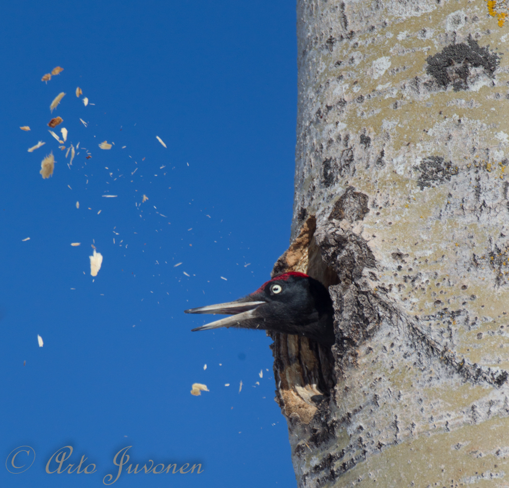 Palokärki PalliBlack WoodpeckerDrycopus martius 9.4.2012 Lapinjärvi, Finland Canon EOS 1D Mark IV, 500 mm * 1.4 ext, f/5.6, ISO-320, 1/2500 sec. From a hide with a tripod.