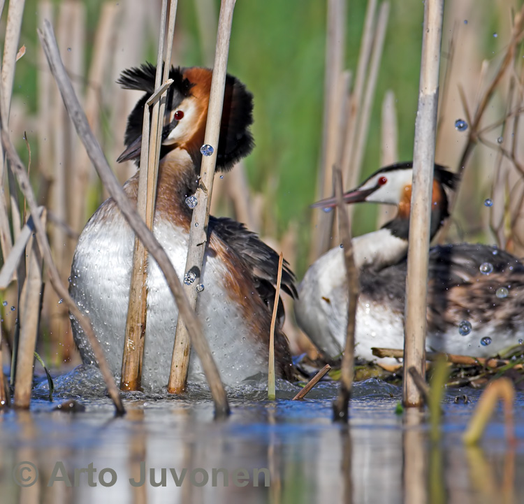 Olisikin ollut melkoinen painajainen olla ilman kameraa tällaisena aikana. Maastossa on "pyynnissä" neljä mainiosti toimivaa piiloa, eikä uusista paikoista olisi pulaa. Lapinjärven kaksi piiloa pystytettiin yhdessä Henrik "Lundfoto" Lundin kanssa. Kiitokset Henkalle, että kojut saatiin pystyyn hyllyvälle luhdalle. Rannalta tuli kuvattua muun muassa kirkkaasti parhaat tukka- ja punasotkakuvani ikinä. Silkkiuikun pesällä pääsin aamun aikana kuvaamaan neljää parittelua. Viikon kuva on yhden parittelun jälkeinen tilanne.