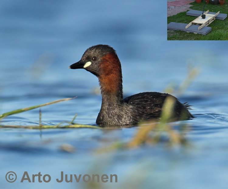 Kesäloman ensimmäinen viikko oli auringonpaistetta ja hellettä. Pönttökuvaus iltapäivän kuumimpina tunteina oli turhan hikistä puuhaa, vaikka avuksi saattoi hakea kylmää juomaa jääkaapista kortin tyhjennyksen lomassa. Huono puoli oli, että refleksit heikkenivät jokaisesta janojuomasta. Auringossa makaajaksi ei minusta ole, mutta nyt oli pakko kestää. Emot kantoivat ruokaa pöntön isoille poikasille jatkuvana virtana, joten tilanteita kuvan ottamiseen riitti. Menetelmä oli seuraava: riittävän valotusajan saamiseksi heijastin pöntön etupuolelle auringon valoa kaikkiaan kolmella peilillä. Näin pääsin ISO200 herkkyydellä ja f/5.6 aukolla 1/3200 sekunnin valotusaikaan, jolla siipien liike jo pysähtyi. Polttovälinä zoomissa oli 73 mm. Tarkennus oli valmiiksi asetettuna kolon yläreunaan. Myös aukko ja suljinaika olivat manuaaliasetuksella. Vaikea osa oli saada lintu juuri oikeaan kohtaan kuva-alaa.. Alempana on pari esimerkkiä kuvista viikon muista projekteista. Henrik Lundin kanssa rakennettu laituripiilo tuottaa mukavasti. Nokikanan poikasten kuoriutuminen oli vahdinnan alla, eikä päässyt livahtamaan ohi. Poikaset ovat kerta kaikkiaan ihastuttavia olioita! Nokikanaemot taas ovat tavattoman helliä ja huolehtivia. Lämmitysvuorossa oleva emo rapsuttelee alinomaa poikasiaan. Alun perin ideasta kahluupiilosta saa kait kiittää Lassi Kujalaa - tai ainakin minä hänen verkossa olevan informaation perusteella asiasta kiinnostuin. Henrik Lund oli sitten avainhenkilö järjestämään sopivaa materiaalia kellukkeisiin. Kiitokset molemmille! Kolmella ensimmäisellä kahluupiiloretkellä pääsin kuvaamaan neljää uikkulajia, joista esimerkkikuvana se harvinaisin eli Pikku-uikku. Kuvan ylänurkassa on itse kahluupiilon kehikko, jonka päälle levitin yksinkertaisesti maastokankaan. Vesijuoksu kahluuhousuissa vaatii kuntoa!