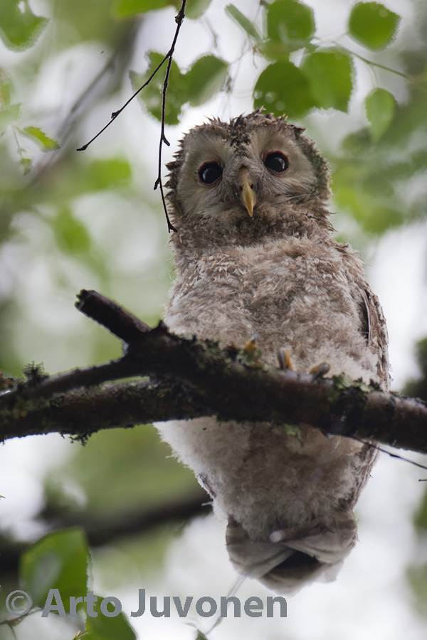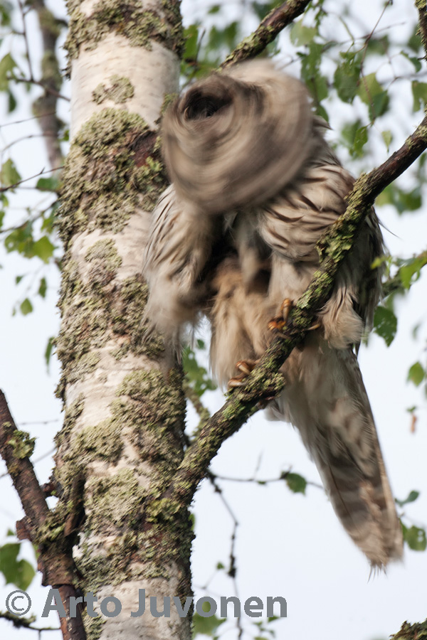 Nestlings of Ural Owl have already left their nest. At the weeks picture is one of juveniles shortly after a heavy shower. Below an adult Owl make a spin-dry. Palauteosio ei ole toistaiseksi käytössä
