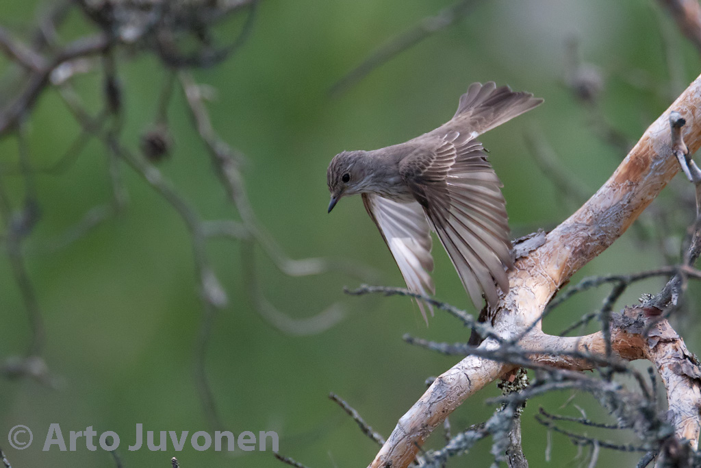 Viikonvaihde piti sitten selvitä vanhan Mark III:sen kera. Retkeilyn laadulle ei kameramerkillä ole merkitystä. Sateinen lauantai olikin oikeastaan todella mukava päivä, sillä monta hyvää löytöä tuli vastaan. Aamupäivällä kuulin liikkuvaan autoon outoa linnun laulua. Sateisessa hyttysten täyttämässä ryteikössä meni jokunen aika äänen lähteen perässä. Huonosti näkemäni laulaja oli melkoisen varmasti lehtokerttu. Iltaretkellä löytyi viirupöllön maastopoikaset ja sarvipöllöpoikue. Iltaretken päätti jo hämärissä pellon pintaa saalis kynsissään lentänyt kanahaukkakoiras. Lentosuunta johdatti minut kuvauskelpoiselle kanahaukkojen saaliinvaihtopaikalle. Kuvassa alla viirupöllöemo linkoaa itseään kuivaksi sateen jälkeen. Toisessa kuvassa harmaasieppo ponnistaa lentoon kalliokelon oksalta.