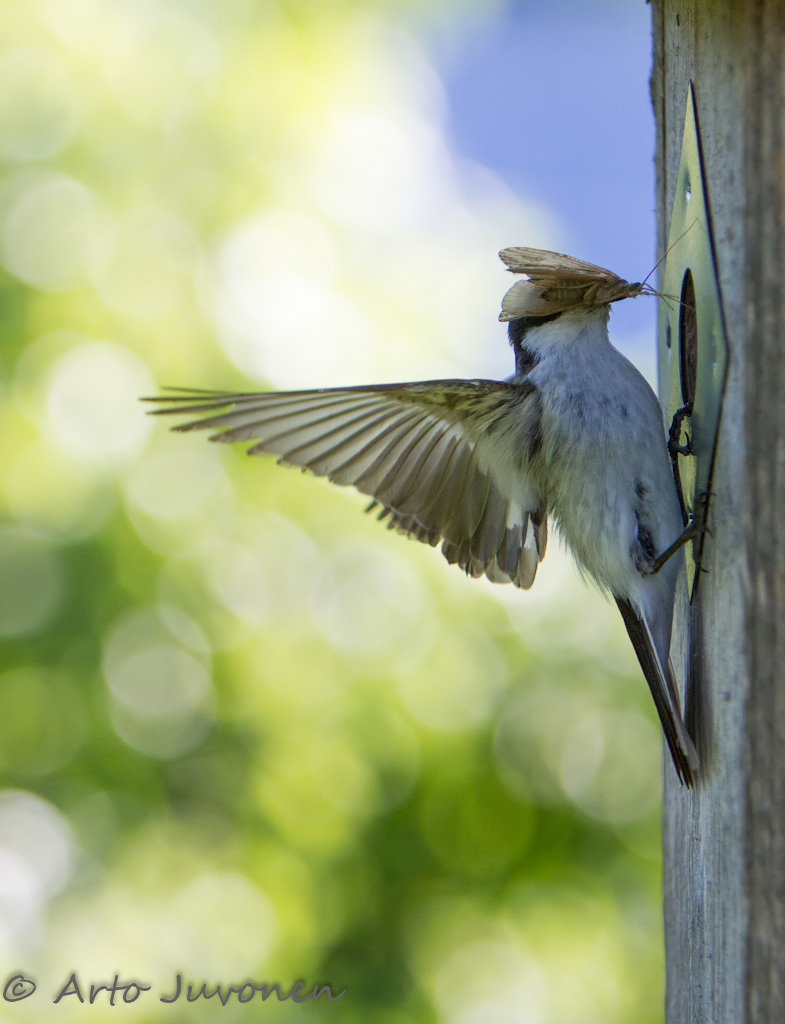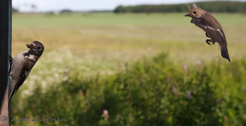 Vuosissa on pieniä eroja, mutta aika paljon samat kuvauskohteet toistuvat. Juhannusviikolla monnissa pesäpöntöissä tapahtuu poikasten ruokintaa, ja sitä on tullut kuvattua vuosittain - ja varmaan tulee vastakin. Vikkariksi vaimoni valitsi tarjokkaista kirjosiepon pöntön suulla.