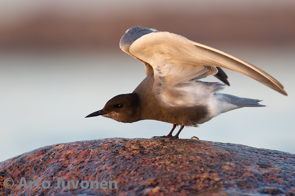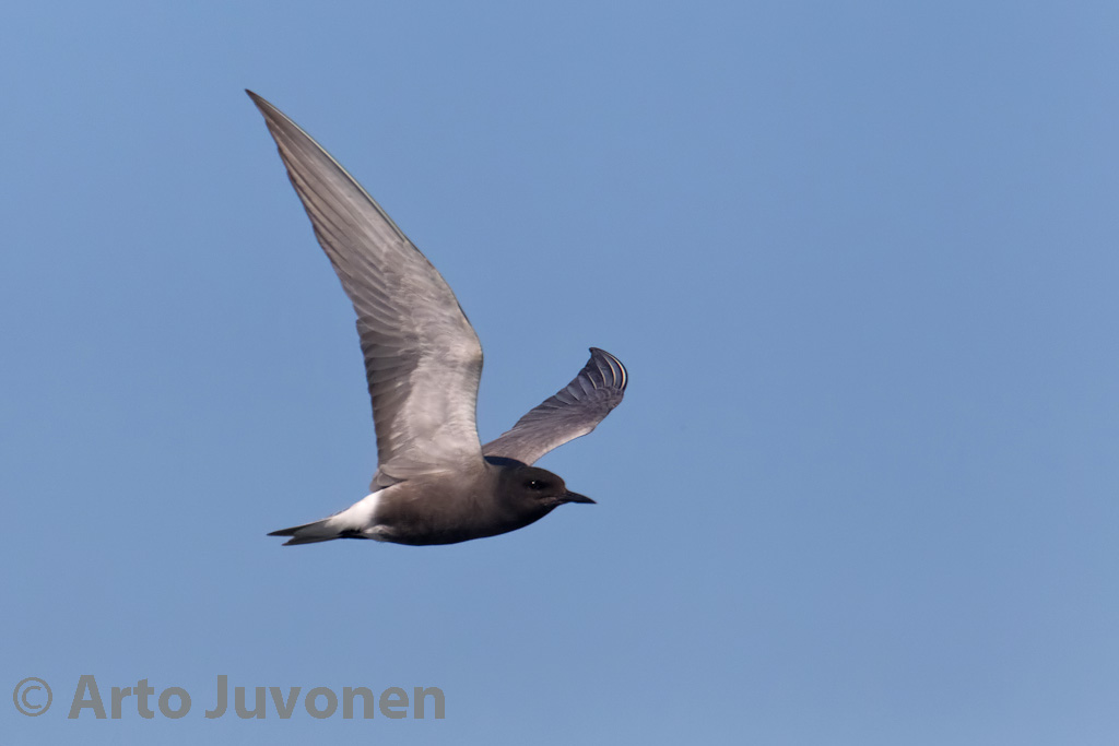 Viikkarin tulevan lintulajin valitseminen oli tällä kertaa helppoa, sillä koko läkähdyttävän viikon suunnilleen ainoa kuvaamani laji oli mustatiira. Oli ensimmäinen kerta, kun lajia sain kunnolla kuvaan. Kuten monet hyvät löydöt, tämäkin tapaaminen sattui täysin yllättäen. Olin ulkomerellä aikeissa kuvata juuri lentokykyisten lapin- ja kalatiiran poikasten ruokintaa ja muuta elämää, kun yllättäen totesin tiirojen joukossa lentelemässä tämän tumman keijukaisen.