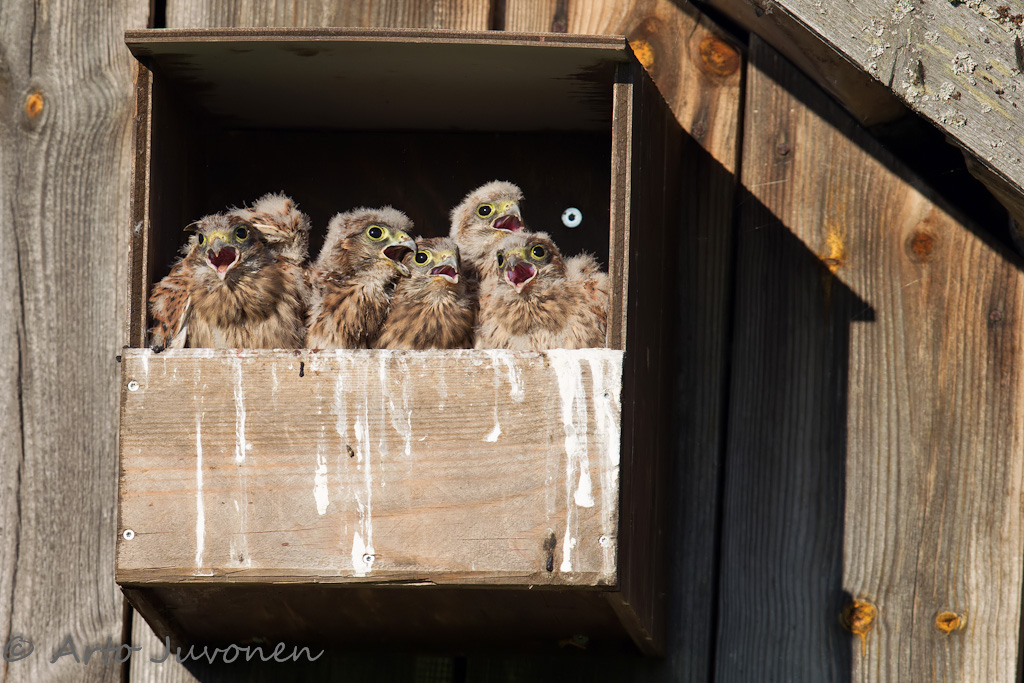 Porvoonseudun Lintuyhdistyksen tuloksellisen tuulihaukkaprojektin kunniaksi laitan viikkariin kuvan nälkää huutavasta haukkapoikueesta. Tiina Mäkelä ja kumppanit ovat pöntöttäneet urakalla seudun peltoaukeita. Tuloksena on tänä kesänä noin 60 pöntöissä pesivää paria. Poikasia pesissä on kaikkiaan noin 250.