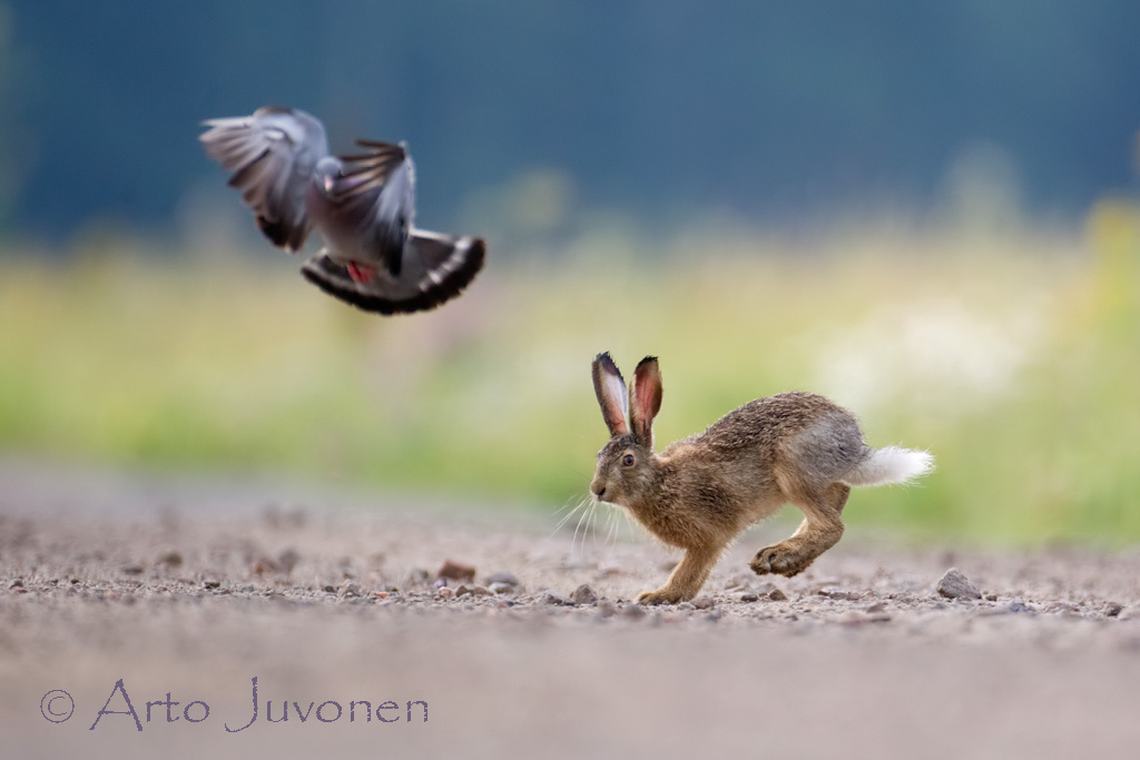 Yksinäisen uuttukyhkyn ruokailessa tiellä, paikalle pomppi nuori rusakko. Hämmästyin melkoisesti, kun rusakko alkoi ajelemaan pienin pyrähdyksin pakenevaa kyyhkyä takaa. Välillä rusakko, ilmeisesti laukaisimen ääntä pelästyen, pakeni heinikkoon, mutta palasi hetken päästä pitämään hauskaa kyyhkyn rauhan kustannuksella. Jos alla olevassa kuvassa kyyhky olisi tarkennusalueella, se olisi viikkarina. Otsakkeen "lintukuva" alle en laita pääkuvaksi kuvaa, jossa rusakko on pääosassa.