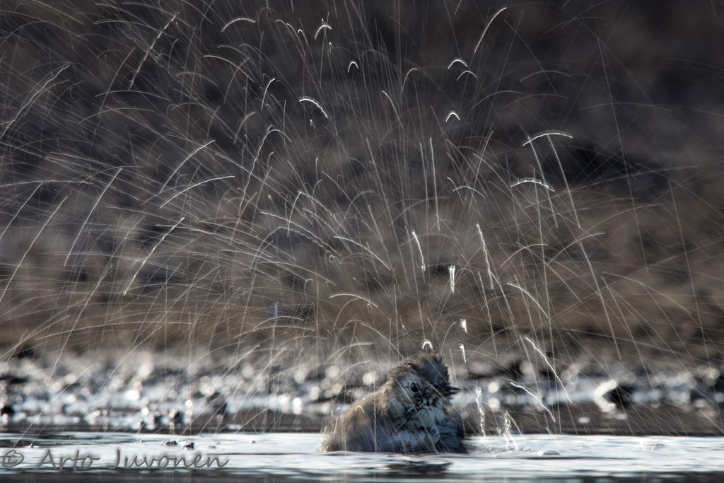 In the picture of the week is a juvenile White Wagtail. I took the picture with quite a long exposure time, to get flying drops like a long lines in the picture.