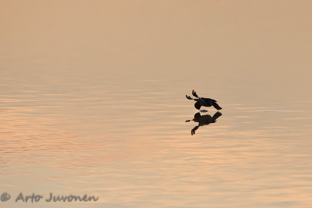 Jaaha, mitä paremmat ovat laitteet ja mitä tarkempaa kuvamateriaalia syntyy, sitä enemmän huomio kiintyy erikoisiin kuviin, joiden ottamiseen riittäisivät ehkä vanhemman sukupolven laitteet. Toki voi olla, ettei moni runko olisi ehtinyt tähän törmäpääskyn heijastumaan tarkentaa. Viikkarin valitsija tykkäsi kylläkin eniten alla olevasta haarapääskykuvasta, jossa lintu poimii hyönteisen vedenpinnasta. Viikkari valittiin kuitenkin erikoisuuden perusteella. . Pisteet varmaan jakaantuvat, mutta ainakin tämä herättää mielipiteitä. Jo heti etsimen läpi nähtynä oli selvää, että nyt syntyi jotain erikoista. Mutta kuinka tuollainen heijastuma on yleensä mahdollinen? Linnun takana auringon suunnassa oli tumma uivan telakan runko. Aurinko osui lintuun, mutta runko varjosti veden pinnan
