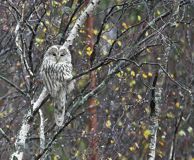 Mielipiteet kotiäänestyksessä menivät tällä kertaa tasan alla olevan viirupöllön ja närhikuvan kanssa. Viirupöllön näin moottoritien varrella päivystämässä ajellessani lauantaina kohti Espoon Korpilammella pidettyä luontokuvaajien syyspäiviä tapahtumaa. Matkaan tuli tunnin viive, kun piti käydä hakemassa kamera ja ottaa kuvat. Jos ei olisi ollut sateista kuvaushaluja hillitsemässä, olisi viivettä syntynyt paljon enemmän. Tämä havainto lisättynä muutamiin muualta kuultuihin antaa viitteitä siihen, että viirupöllöt ovat jo nälkävaelluksella.