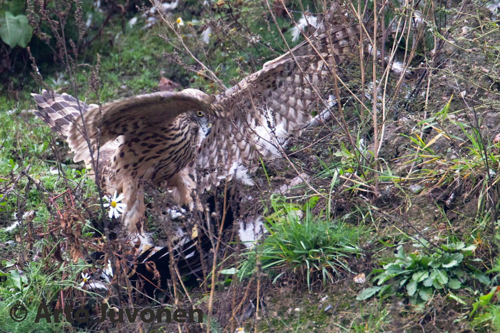 I have nothing else to offer from past week than a picture of a juvenile Goshawk just caught a Hooded Crow. A big flock of alarming crows led me to place where the Goshawk had just caught the prey. The Crow fought back quite some time, but could not resist the power of female Goshawk. When the Crow in claws fell silent, all the other crows left the place. |