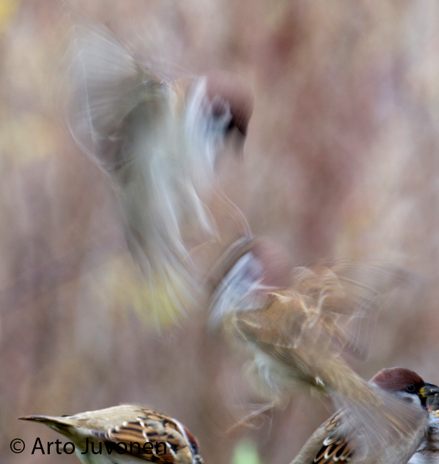 Sunnuntai meni ajellessa ja ruokintapaikkojen huollossa - ei yhtään kuvaa. Lauantaina kuvailin piharuokinnalla. Perussyyskuvien lisäksi yritin hieman abstraktimpaa kuvaa. Hirssiruokinta keräsi pihan pikkuvarpuset kasaan, aiheuttaen taistelutilanteita ruokinnan vieressä. Tätä aihetta yritin pitkällä valotusajalla. Yksi tulos näkyy alla. Linnut lumen valossa kirjan voi vielä saada isänpäivälahjaksi, jos tilauksen tekee heti!