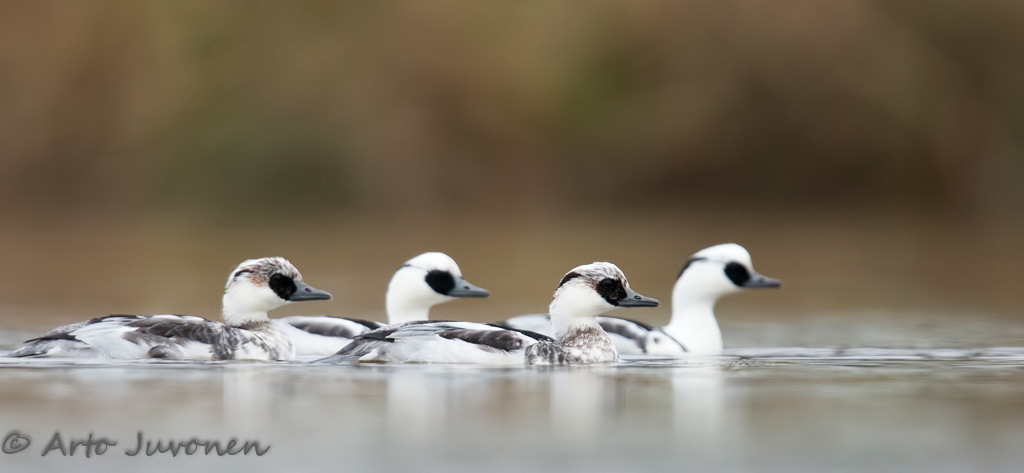 Smews are back at a lake that was already frozen. Mild season has smelt all the ice. Some of adult males have already almost full winter plumage.
