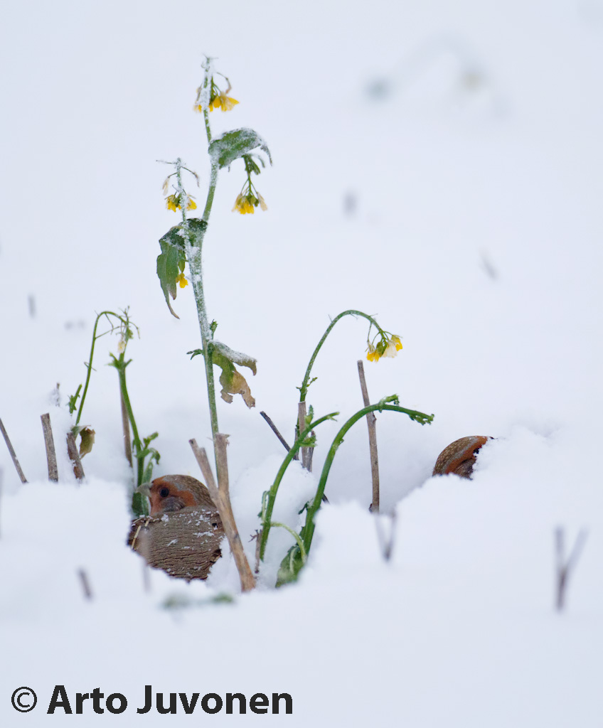Hieno talviviikonvaihde lumisateineen. Kuviakin tuli otettua aika paljon. Jokunen aika hyväkin tuli joukkoon. Viikkariksi valittiin vähän erilainen lintukuva. Kukkakuvaa oikeassa talvessa ei ole tainnut aiemmin tällä palstalla näkyä. Peltopyillä on ollut hyvä pesimäkesä. Lapinjärven aukeilta löytyi vähällä vaivalla kolme parvea, joista yksi omalla mökkiruokinnalla.