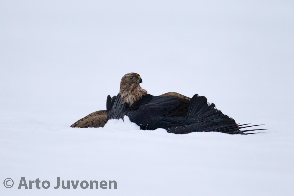 The weeks picture is not selected because bird but because birds with flowers. We have had already hard winter so it was quite surprising to get some flowers in a picture. It was a fine winter weekend with quite many taken pictures. The episode of the weekend was when I was in place when a juvenile female Goshawk tried to take a Raven. After a short fight the Goshawk had to release the prey. I took a series of pictures of the fight, but there was too much snow in air to get good ones.