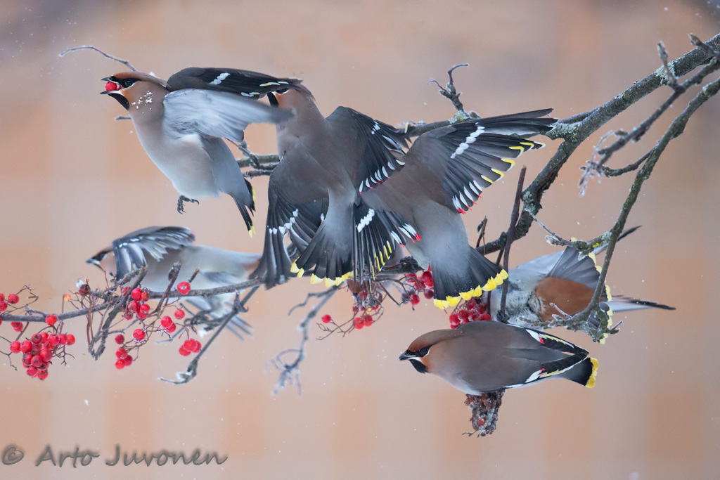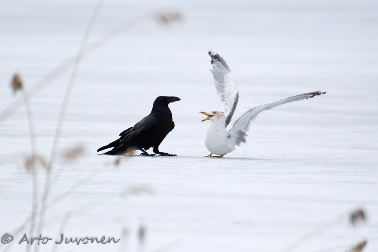 Juhalla tarina syntyi lohen pään, minulla jäälle jätetyn lahnan ympärille. Lohen päästä kiinnostuivat kaksi harmaalokkia, lahnan ympärille kerääntyi kymmenisen harmaalokkia ja muutama varis. Seuraavaksi molemmille näyttämöille ilmestyi korppi. Juhan paikalla haaskan ääreltä siirtynyt korppi otti jutun ilmeisesti leikin kannalta, mutta joka tapauksessa ei pärjännyt kahdelle harmaalokille. Lahnan ympärillä kaikki väistivät kiltisti korppia. Korppi repi nokallisen lahnaa mukaansa, lensi jonnekin viemään löytönsä varastoon, ja palasi hetken päästä hakeakseen taas uuden lastin.
