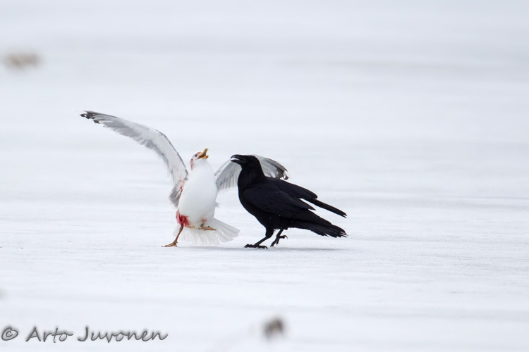 Juhan tarinassa korppi sai toisen kaveriksi, mutta kalanpään herruus ei sillä ratkennut. Kuuden korpin yhteistoiminta ratkaisi tilanteen mustien lintujen eduksi. Minun tarinassani ei leikitty. Yksi onneton haraalokki ei ehtinyt väistyä lahnan ääreltä korpin taas palatessa. Nyt korpille ei riittänyt, että harmaalokki tajusi yrittää pakoon korpin syöksyessä sen selkään. Seurasi noin viiden minuutin taistelu "yhteen maaliin". Verinen näytelmä päättyi harmaalokin kuolemaan.