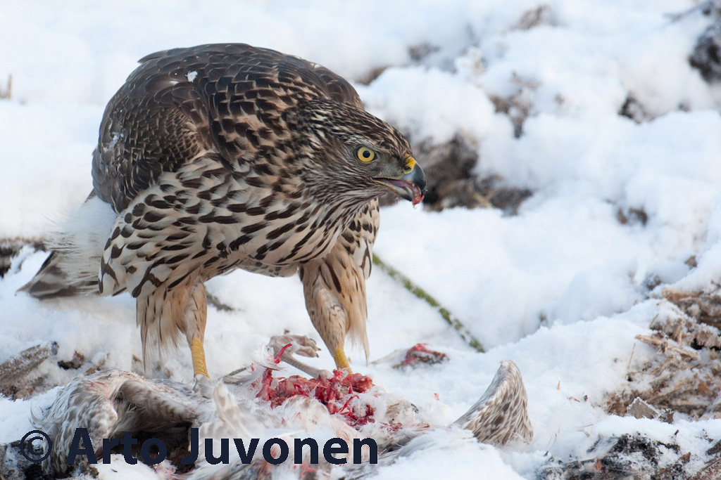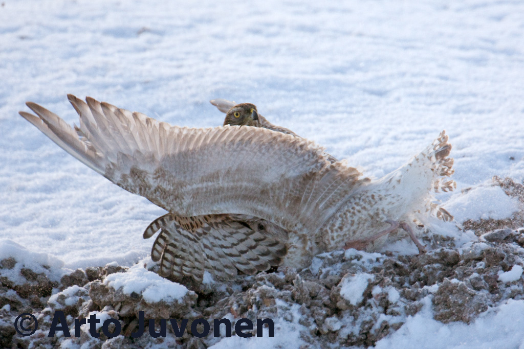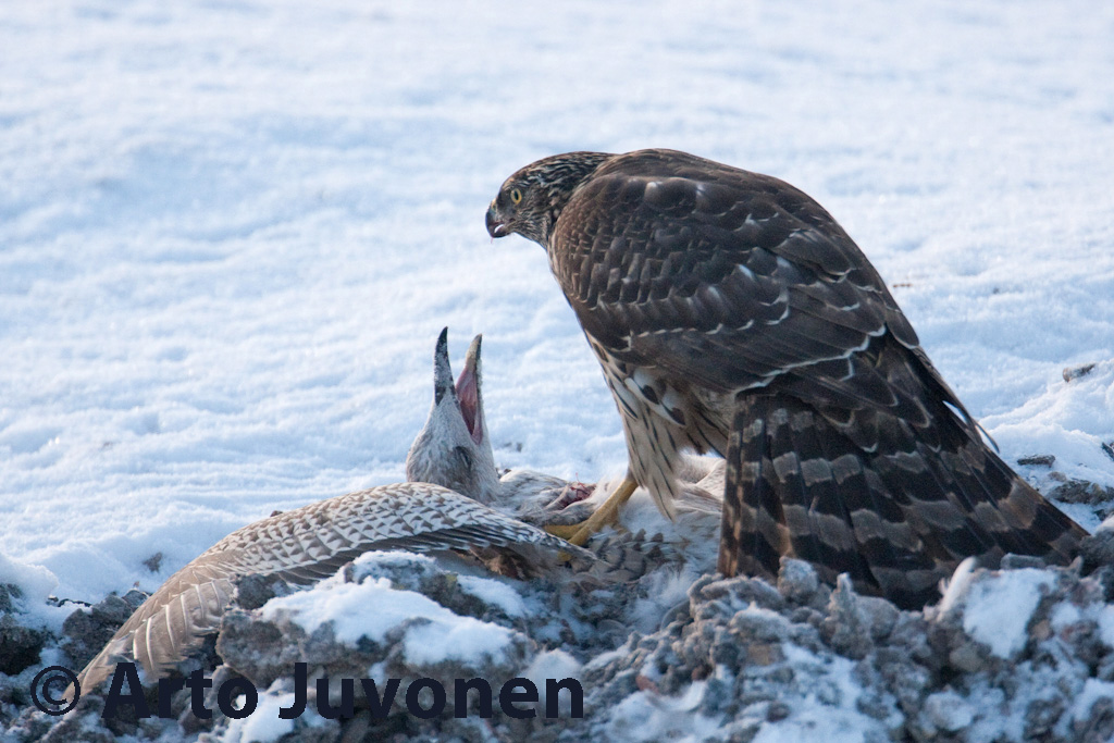 Pitää yhä yrittää - kyllä minä sen kuvan vielä otan! Kaksi viikkoa sitten kirjoitin, että kanahaukka vie saaliin aina metsään jos mahdollista. Merilokki oli niin iso saalis, ettei haukka jaksanut nousta lainkaan ilmaan sen kanssa, etenkin kun lokki oli vielä täysin hengissä. Kanahaukka aloitti aterionnin lokin vielä eläessä, väistellen taitavasti sen isoa iskuvalmista nokkaa. Liitin alle pari lisäkuvaa tilanteesta. Viikko on ollut talvesta tykkäävän unelma. Pakkasta oli parhaimmillaan mukavat noin 20 astetta. Lunta on vielä niukasti. Silti talven alku on ollut ilmeisen kova viirupöllöille. Pidin viikolla kaksi vapaapäivää kuvatakseni viirupöllöjä talvessa, mutta en löytänyt ainoatakaan kuten en myöskään viikonvaihteessa enkä edellisenä. Linnut vauhdissa kirjan osalta tuli viikolla merkittävä tieto: saksan ja hollannin kieliset painokset ovat jo varmoja, muista Euroopan alueen kielisistä painoksista vielä neuvotellaan.