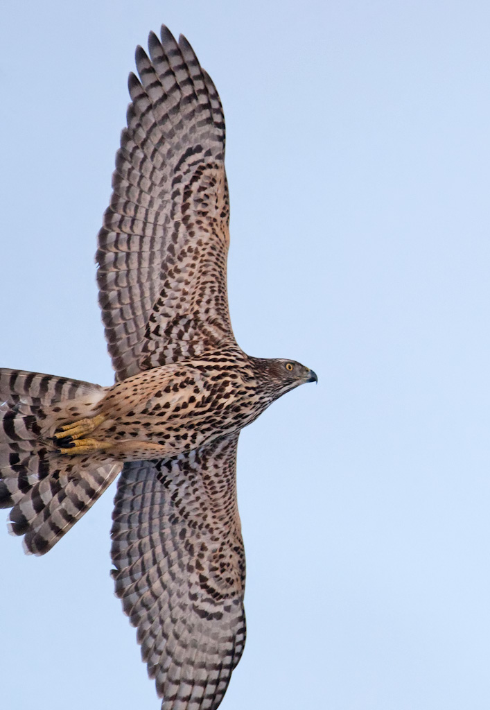 Laitanpa vähän erilaisen kanahaukkakuvan viikkariksi - siluetti vasten aamuruskoa. Alla sama yksilö myötävalon puolella.