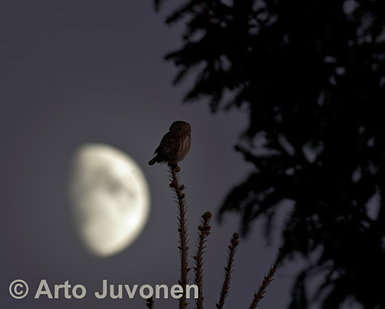 Lauantai-iltapäivän pöllönetsintäajelu päättyi Ruotsinpyhtäällä varpuspöllön löytymiseen. Sen parissa menikin aika mukavasti aina hämärtyvään iltaan, jolloin kadotin pöllön näkyvistäni. Varpuspöllö vaihtoi paikkaa melko aktiivisesti, joten ei ollut ihan helppoa sitä seurailla ja hakea linjaa pöllöstä kuuhun. Tässä paikassa tähystys kesti sen verran aikaa, että ehdin kiivetä kuvassa oikealla näkyvän kuuseen taittamaan muutamat linjalla olleet oksat pois edestä. Saadakseni kuun piirteitä näkyviin haarukoin valotusaikaa ja aukkoa. Tässä kuvassa aukko on f/32 ja valotusaika ¼ sekuntia. Digijärkkäreillä kuvaajat tietävät, mitä saattaa merkitä kuvaaminen aukolla f/32 - kuvassa näkyi PALJON pölyhiukkasia kameran kennolta. Ne olen kuvasta pääosin saanut putsattua. Kuvaushetki olisi saanut olla vielä hetkeä myöhäisempi. Tässä päävalo pöllöön tulee vielä laskeneen auringon suunnasta. Mikäli kuun valo olisi ollut päävalo, se näkyisi kuten kuvassa vuoden takaa.