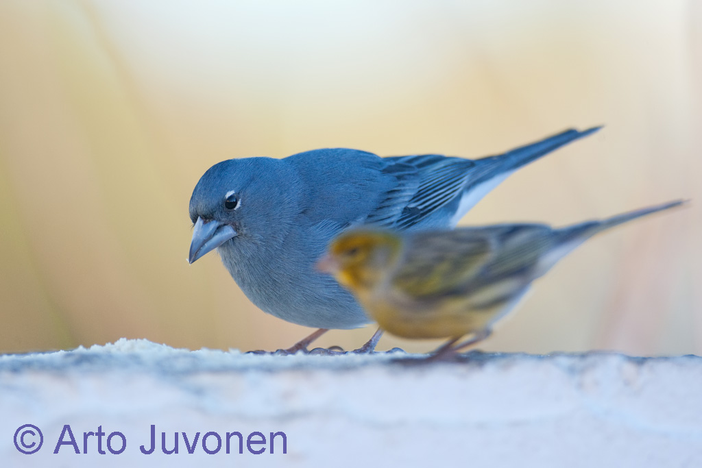 Sinipeippo, kanarianhemppo edustalla Blue Chaffinch with a Canary foreground Fringilla teyde Teyde, Teneriffe, 31.12.2009 Canon EOS 1D Mark III, EF 500 mm F/4 L IS USM * 1.4 ext. |