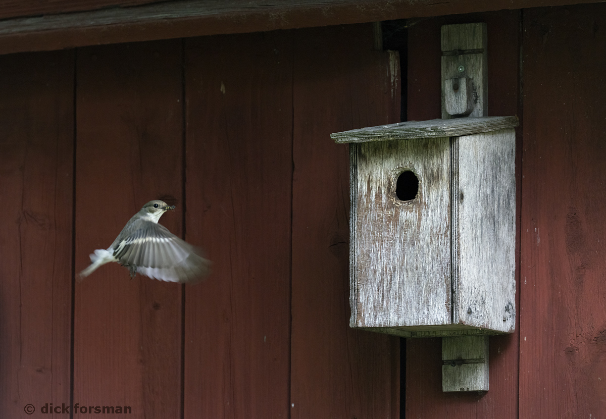 The Pied Flycatchers (Ficedula hypoleuca) are busy feeding their young in a nest box on the wall of our garden shed. |