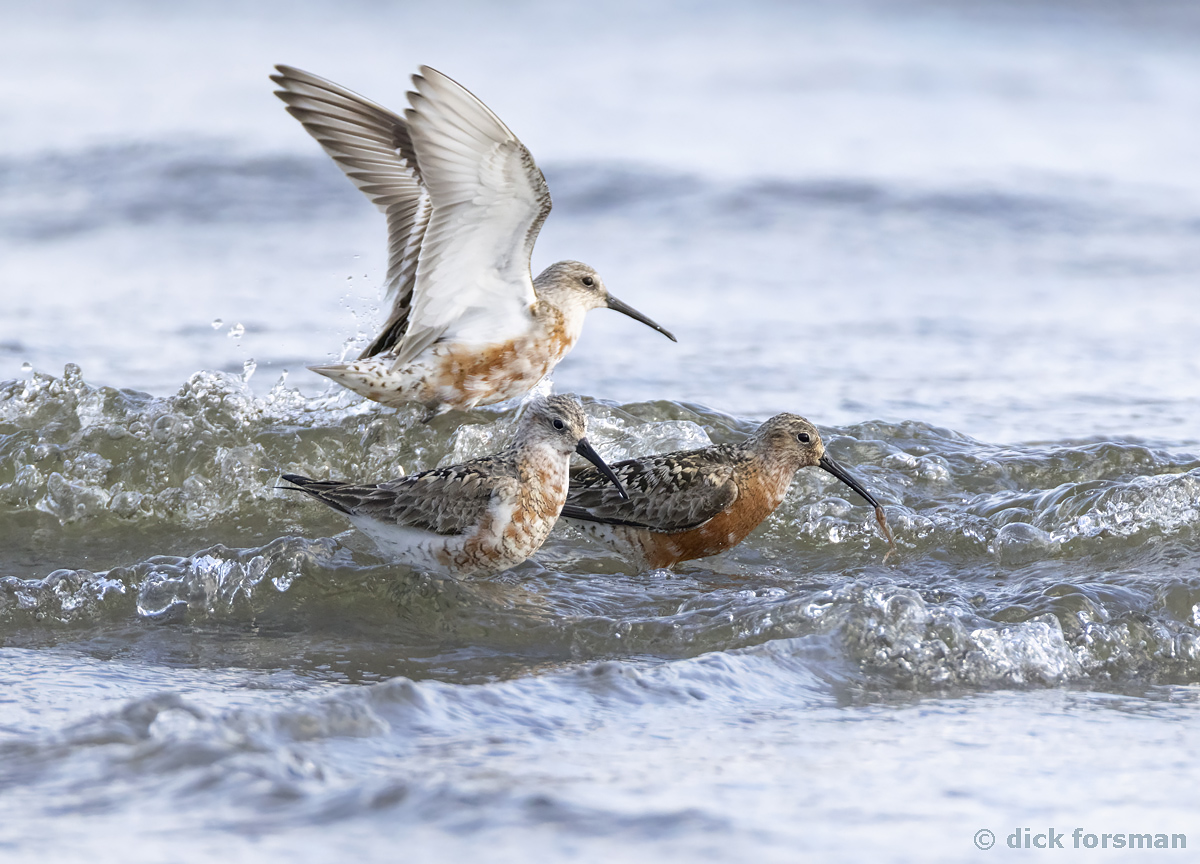 Adult Curlew Sandpipers (Calidris ferruginea) feeding in the shallows on the Finnish south coast. |