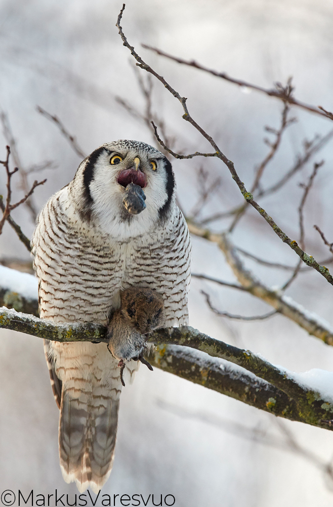Hawk Owl vomits the pellet out before eating next vole. Time from camera: 2017:12:02 Copyright: Markus Varesvuo Leikosaarentie 31B49 00990 Helsinki Finland +358405033831