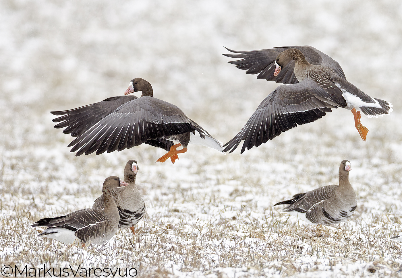 26 March 2023 Helsinki Finland. Takatalvi on pysäyttänyt isohkon määrän hanhia tankkaamaan Helsingin Viikkiin. Linnuilla on kuitenkin kelistä huolimatta jo kevättä rinnassa ja pieniä yhteenottojakin näkyi.. RF600F4.0+ 1.4X, 1/4000s, F6.3, ISO 4000