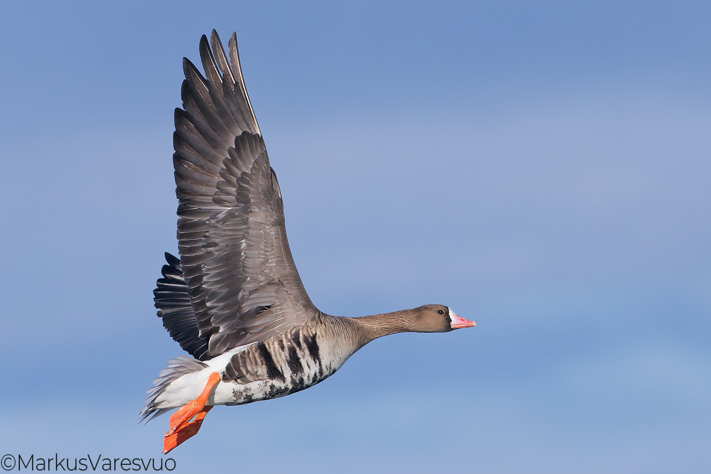 An adult White-fronted Goose in flight (Ansser albifrons).