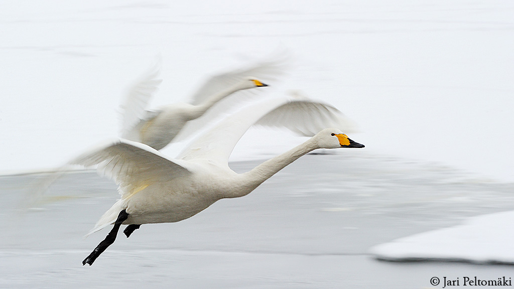 | Viikon kuvassa on laulujoutsenet Photo of the week is Whooper Swans (Cygnus cygnus) 18.2.2011 Lake Kussharo, Hokkaido, Japan Nikon D3s + 200 - 400 mm (f5.6) at 140 mm, 1/125 sec, f16, ISO 800, flash, camera handheld Minulle sattui pieni onnettomuus ja en ole päässyt kuvaamaan, vaan olen käyttänyt aikani kuvien tekemiseen ja kuvauspaikkojen valmisteluun. Sen vuoksi jouduin valitsemaan viikon kuvaksi viime helmikuussa Japanissa kuvaamani laulujoutsenet. Aihe sopii hyvin tähän vuodenaikaan, koska joutsenet ovat juuri palaamassa takaisin Suomen vielä varsin talvisiin olosuhteisiin. Kevät tekee tuloaan kovaa vauhtia ja toivottavasti jo ensi viikolla pääsen taas kuvaamaan? "Teeren soidin lumella"- kuvaukset ovat juuri nyt parhaimmillaan! Liminganlahden lintukuvafestivaalit järjestetään 16.4.2011. Festivaaliohjelma on nyt julkaistu Liminganlahti - sivuilla. Bence Máté (Wildlife Photographer of the Year) tulee tilaisuuteen esitelmöimään lintukuvaustekniikoistaan. Kotimaisia esiintyjiä ovat Jarmo Manninen, Esko Pitkänen, Benjam Pöntinen, Mauri Leivo, Jari Peltomäki ja Juha Haikola. Luontokeskuksessa pyörii Erkki Toppisen kuvaesitys non-stoppina. Lintukuvafestivaaleilla julkaistaan Docendon kustantama Lintukuvauksen käsikirja (Varesvuo - Máté - Peltomäki). Kirjaa on myynnissä julkistamisen yhteydessä erikoishintaan 39 euroa (kirjan normaalihinta on 44 euroa). Tilaisuudessa Bence ja Jari kirjoittavat halukkaille nimikirjoitukset kirjaan. Katso lyhyt kuvaesitys Lintukuvauksen käsikirjan sisällöstä.