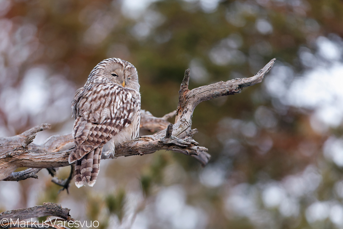 Aperture F-number f/4.0 Exposure Time: 1/500 ISO: 8000 Image information: Ural Owl (Strix uralensis) Helsinki Finland March 2024 Time from camera: 2024:03:11 Copyright: Markus Varesvuo Pursilahdenranta 2B22 00980 Helsinki Finland +358405033831 markus.varesvuo@lintukuva.fi Camera: Canon EOS R3 Focal Length: 600/1 | |