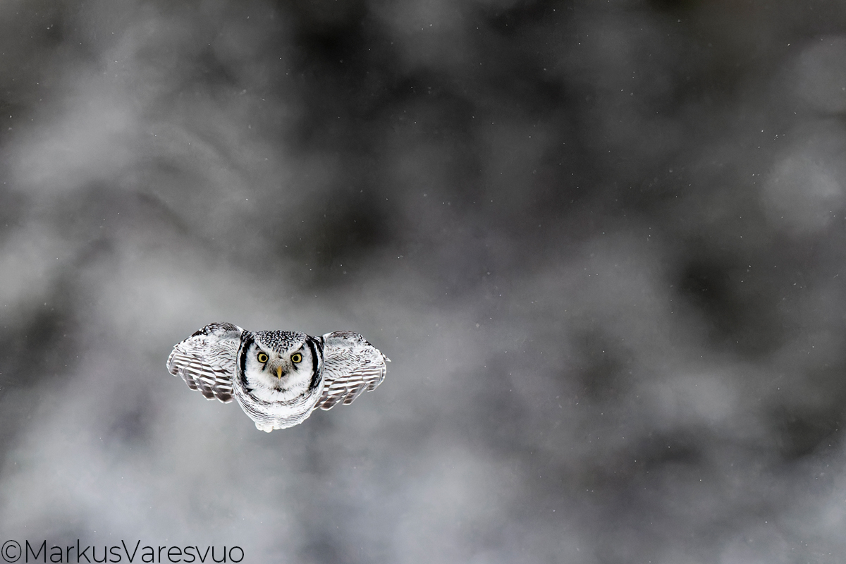 Aperture F-number f/4.0 Exposure Time: 1/6400 ISO: 12800 Image information: Hawk Owl (Surnia ulula) Kuhmo Finland February 2024. Time from camera: 2024:02:04 Copyright: Markus Varesvuo Pursilahdenranta 2B22 00980 Helsinki Finland +358405033831 markus.varesvuo@lintukuva.fi Camera: Canon EOS R3 Focal Length: 400/1 | |