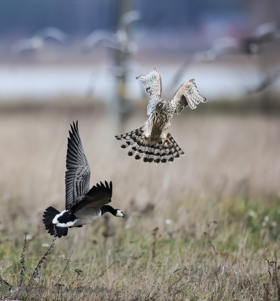 Kanahaukka ja valkoposkihanhi Northern Goshawk and Barnacle GeeseAccipiter gentiles & Branta leucopsis 14.11.2021 Lapintiira, Finland Canon R6, 600mm, f/4, ISO-2000, 1/3200 sec, Hand held |