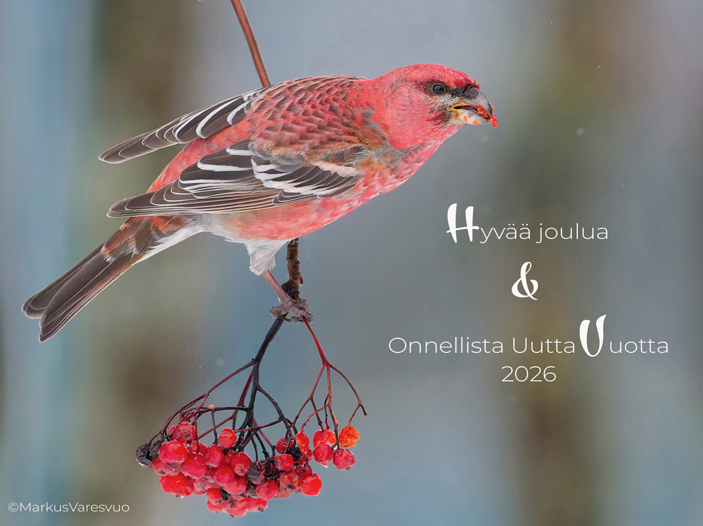 A handsome male Pine Grosbeak feeding on rowanberries.